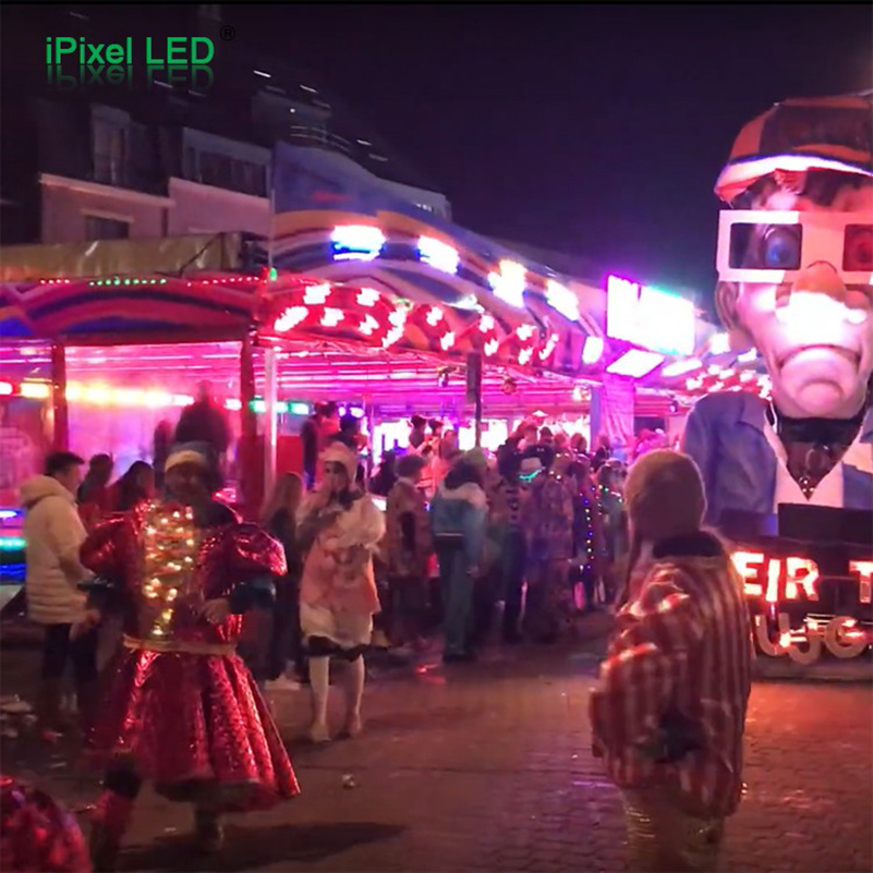 该项目由公海jcjc5500的比利时客户完成 为了庆祝狂欢节活动,人们正在穿着闪闪发光的衣服唱歌和跳舞, 因为他们的衣服用低压LED像素灯装饰。