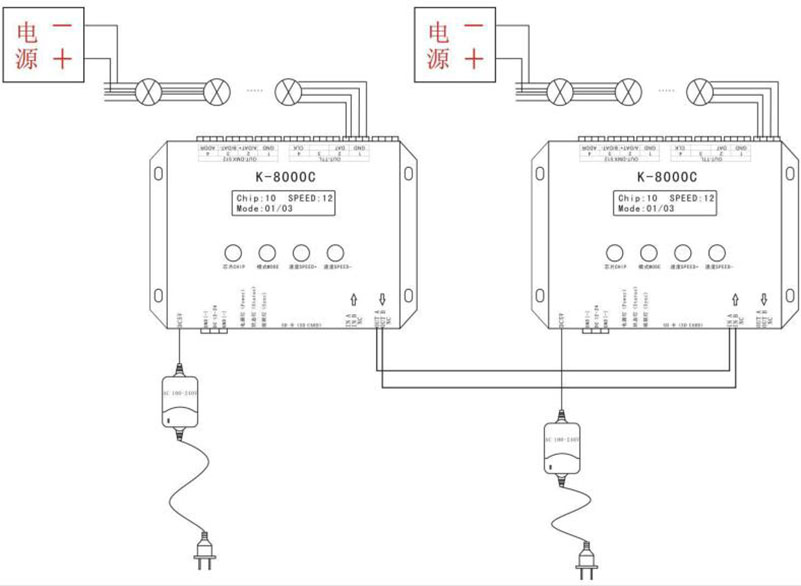 5、控制器可单台使用,也可多台级联使用,级联光电隔离方式:抗干扰,稳定性更好,两台控制器级联距离可达150米,需使用0.5M²纯铜电源线。