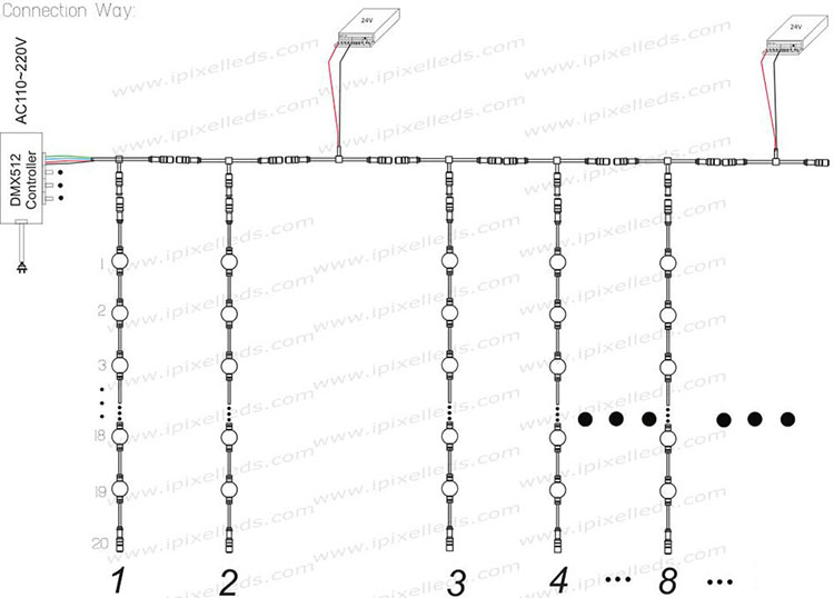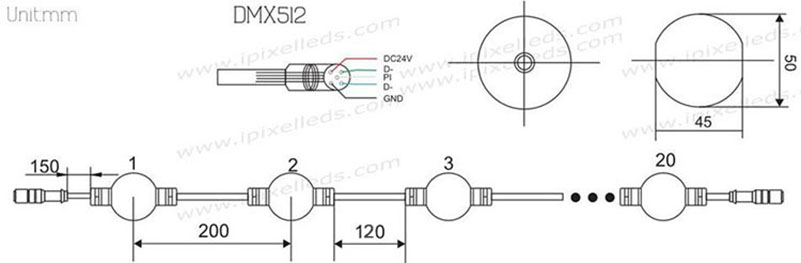 4.There are 20pcs pixel ball in a string, wire distance between each ball is 12cm,20AWG Copper wire,